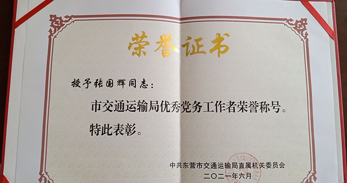 • 張國輝榮獲“市交通運輸局優(yōu)秀黨務(wù)工作者”