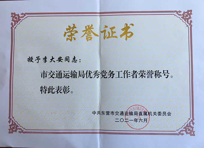 • 李大安榮獲“市交通運輸局優(yōu)秀黨務(wù)工作者”
